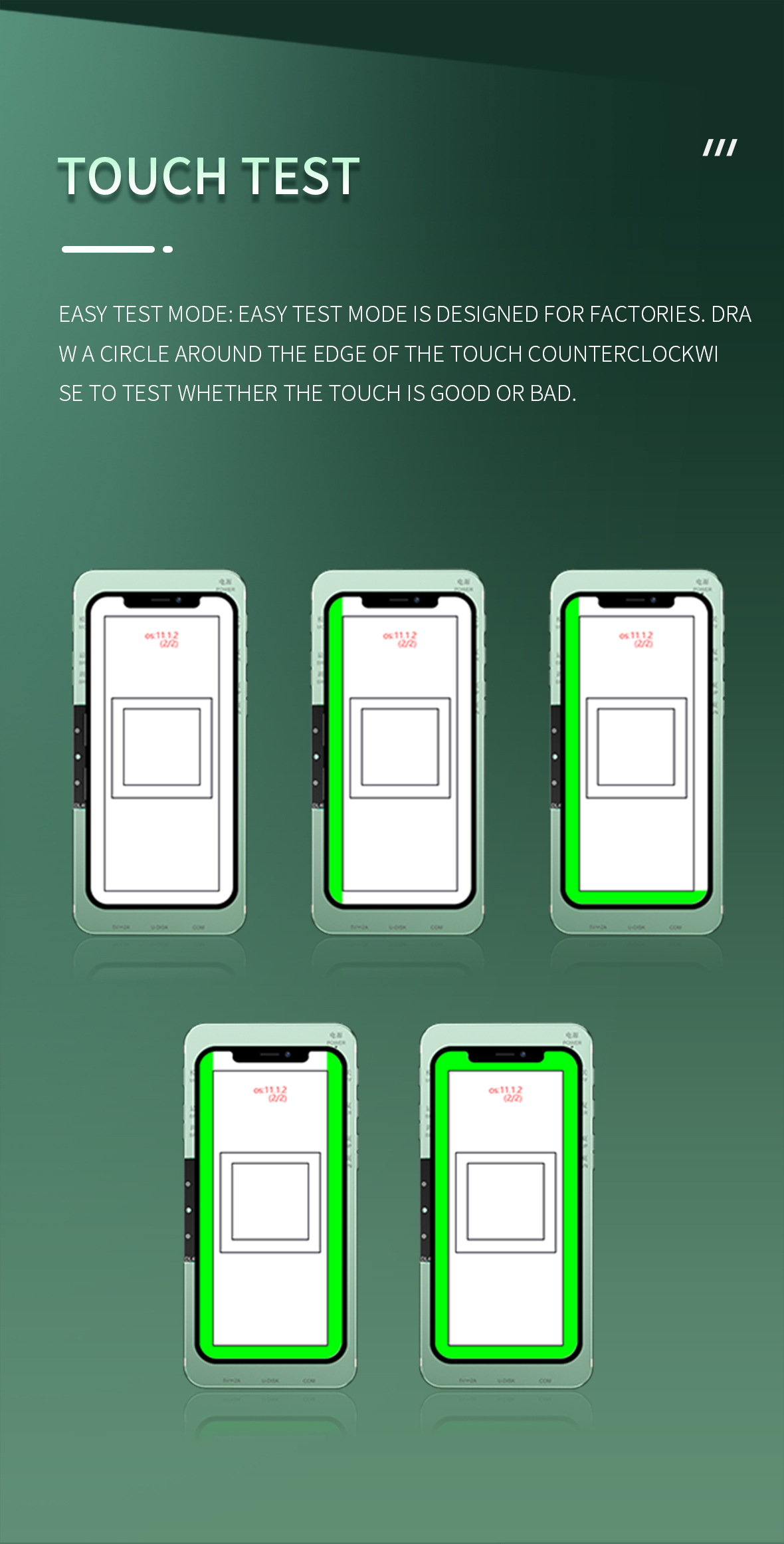 Simple mode: The simple test mode is specially designed for factories, press counterclockwise to draw a circle along the edge of the touch to test whether the touch is good or bad.
